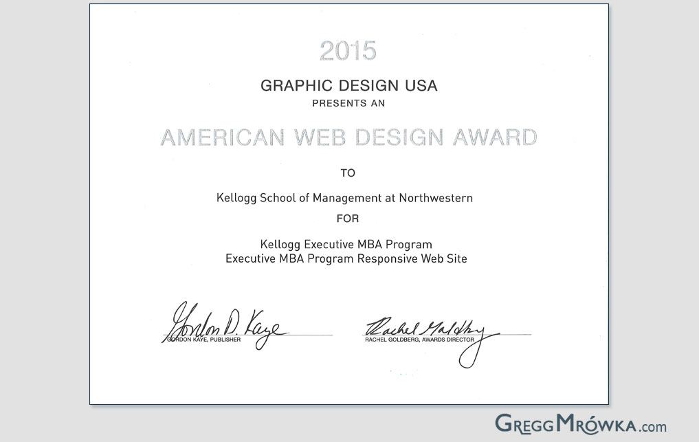 In 2015 we continued launching more webistes with the newly designed Inspiring Growth Branding for the Kellogg School of Management. This award was for the Kellogg Executive MBA Program Responsive Web Site.