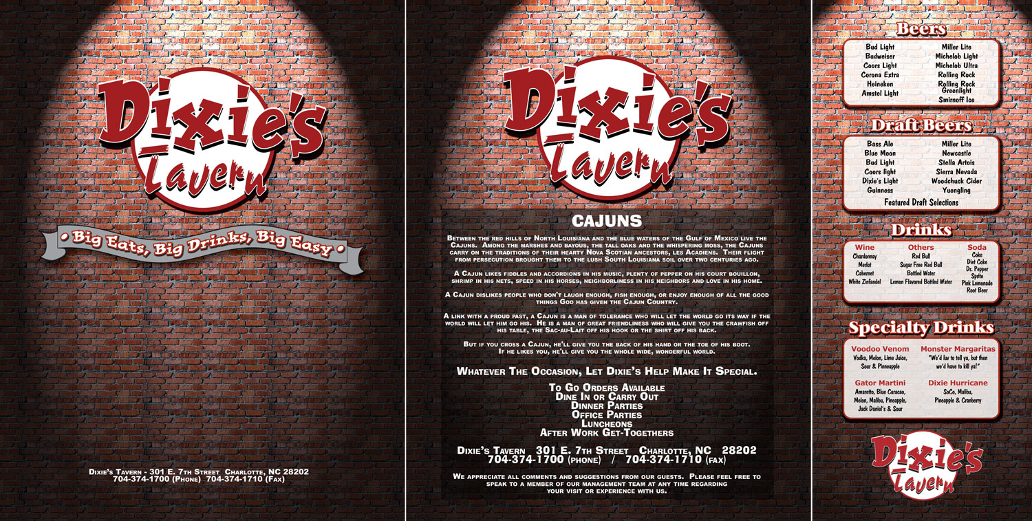 While at Full House Productions I was part of a team of graphic designers and created a large array of print materials for Night Clubs and Bars all across the United States. Here I designed and laid out the food menu for Dixie's Tavern in Charlotte, NC and Greenville, SC. They were printed on 8.5" x 11" sheets and fitted into plastic sleeve tri-fold menus.